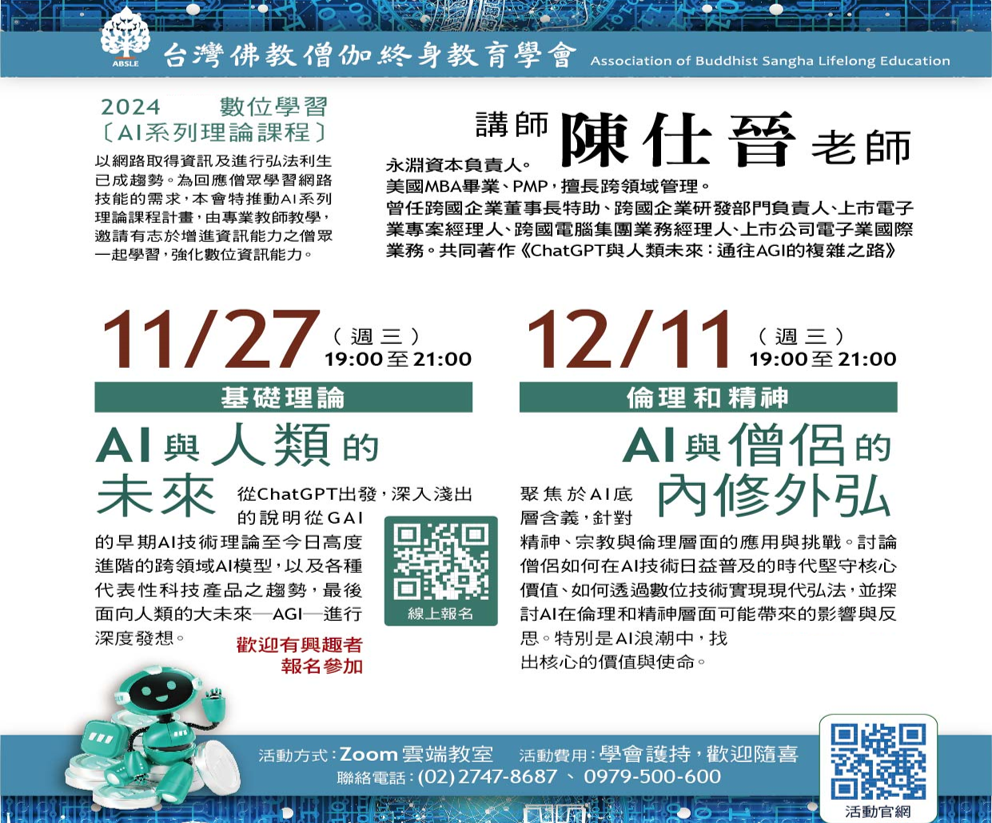 12月11日(週三)19:00~21:00 AI與僧侶的內修外弘:倫理和精神