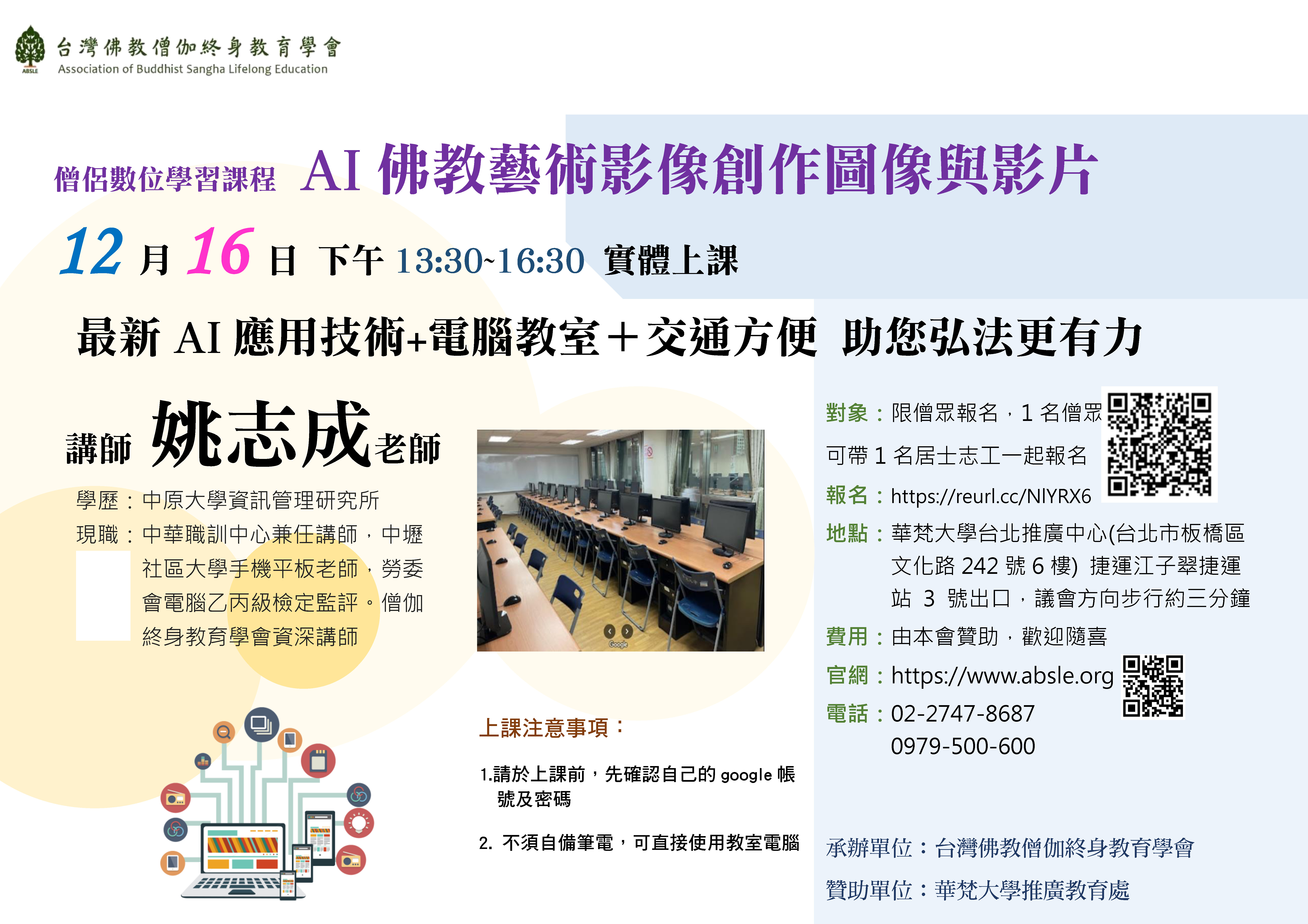 課程日期:12月16日(週一)13:30~16:30 AI佛教藝術影像創作圖像與影片