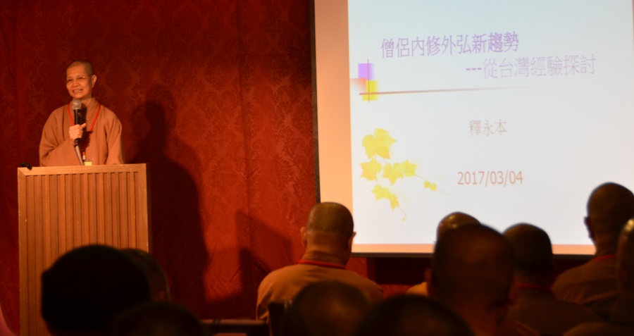 第一個主題是「僧侶內修外弘的新趨勢:從台灣經驗探討」,由佛光山電子大藏經主任和佛光山叢林學院教師永本法師提出精闢及充滿創意的觀點。法師以四個子題:(一)台灣的趨勢、(二)僧伽外弘內化的淺見、(三)未來弘化的建議以及(四)結語論述。首先,法師舉出台灣社會少子化、高齡化加速嚴重的現象,以及全球化和科技化對社會所帶來的衝擊。接著,法師舉出如何積極正向面對當前的挑戰,講述內容具有建設性,包括:尊重不同教派,僧信共尊共榮,重視青年、培養人才。其中讓與會者印象深刻的是,法師對「開放」頗具創見:「開放」是一種關照環境的智慧,關懷眾生的慈悲,是洞見「空性」的展現而能不斷創新、打破框架;因此,開放能包容異己、放下成見而虛懷若谷。對於未來建議方面,法師呼籲,佛教內部要團結,重視從小到大的教育,共同以出世精神,作入世的事業。「空性」、「慈悲」與「入世關懷」就在法師清朗、肯定的話語中,為聽眾開展出台灣佛教如何回應時代的挑戰。