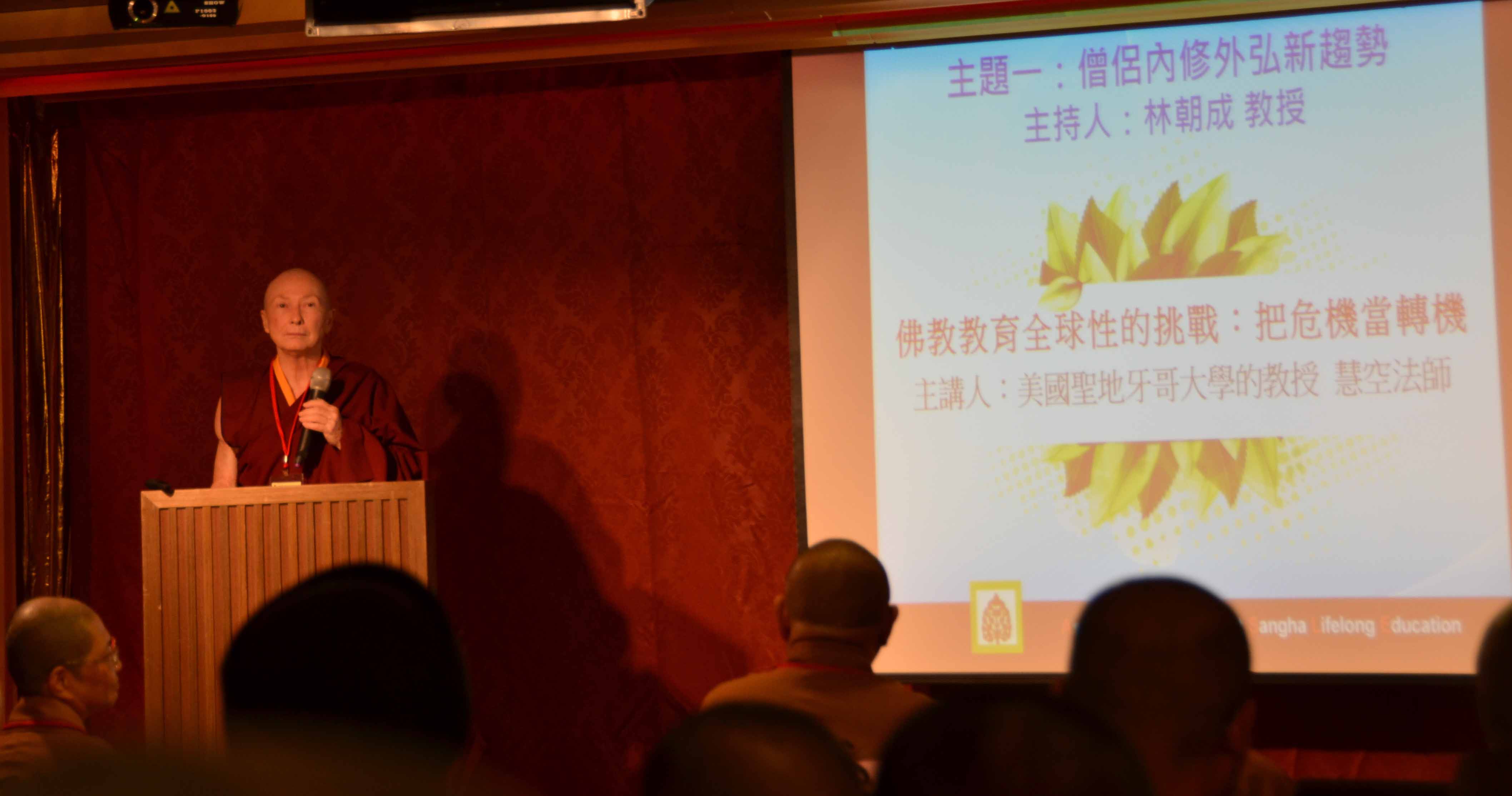 第二位發表者是來自美國加州大學聖地牙哥分校宗教所教授的慧空法師(Karma Lekshe Tsomo),恰逢法師五月底前在政治大學宗教系短期講學,因而能與會發表。對於大會主題,法師從「佛教教育的全球性挑戰:化危機為轉機」提出她個人長期投入佛教教育的體會和建言。首先,法師提出一個極為嚴重的危機問題:二十世紀期間,因為戰爭和政局不穩定導致飢荒、監禁、疾病,在柬普寨、中國、寮國、蒙古、蘇俄、越南和其他等地,佛教失去了大量的學習機構和幾代的合格佛教師資。對於珍貴的佛教教法的傳承和眾生慧命而言,這是極大的損失和危機。幸好,有不少卓越人士,以各種方式復興佛法,例如:重建佛教教育機構,重建寺院、收集殘存的文本並因而弘傳佛法到世界各地。