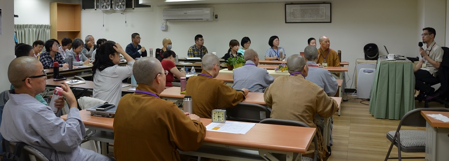 第二天下午的正念練習非常有趣,自鼐法師帶領志工們觀想自己是一株站在海洋裡的水草,志工們聆聽著法師的指示、閉著雙眼、覺察自身的各個部分,同時放鬆地輕輕搖晃著身體,也觀想所有在場的同學都是生命共同體的一員,彼此唇齒相關。這簡短的操練有效地幫助志工們靜下心來,為下一個課程作好準備。