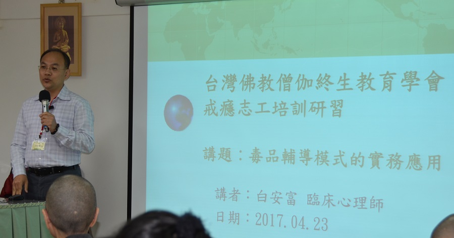106年4月22日(六)至23日(日),社團法人台灣佛教僧伽終身教育學會,為關懷戒治的佛教宗教師、居士和一般大眾,舉辦「戒癮志工培訓研習」。此次研討會的目的是為了:增進志工對成癮起因與成癮防治的相關知識,了解藥物濫用的過程及其對身心造成的影響,以作為志工在備陪伴藥物濫用者的前備知識。此次活動的師資邀請到:法務部矯正署高雄戒治所白安富臨床心理師、衛生福利部心口司藥癮民間機構輔導訪查委員李昭慧臨床心理師、台北市立聯合醫院松德院區成癮防治科主治醫師暨陽明大學醫學院講師洪敬倫醫師、前台大醫院精神科總醫師暨樂活精神科診所院長郭家穎醫師、嘉南藥理大學助理教授暨台灣正念發展協會理事黃創華博士、水面上與水面下劇場藝術總監暨劇場編導張嘉容老師、台灣佛教僧伽終身教育學會理事長暨台灣正念發展協會理事自鼐法師擔任課程講師。